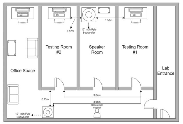 In a controlled lab experiment, thirty-six participants were isolated in a room and exposed to either calming music, typical of a yoga class, or unsettling ambient sounds. Half of the participants also received exposure to infrasound produced by concealed subwoofers. Expectations suggested that infrasound would amplify feelings of relaxation with calming music and intensify discomfort with unsettling sounds.